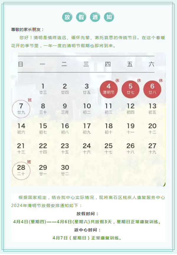 离石区残疾人康复服务中心——2024年清明节放假通知